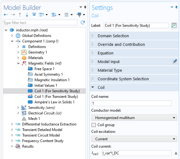The COMSOL Multiphysics UI showing the Model Builder with the Coil feature highlighted and the corresponding Settings window with the Coil section expanded.