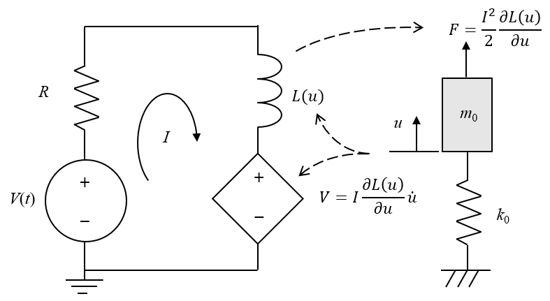 A schematic of the electromechanical lumped model consists of a circuit model and a lumped mechanical model coupled by the force.